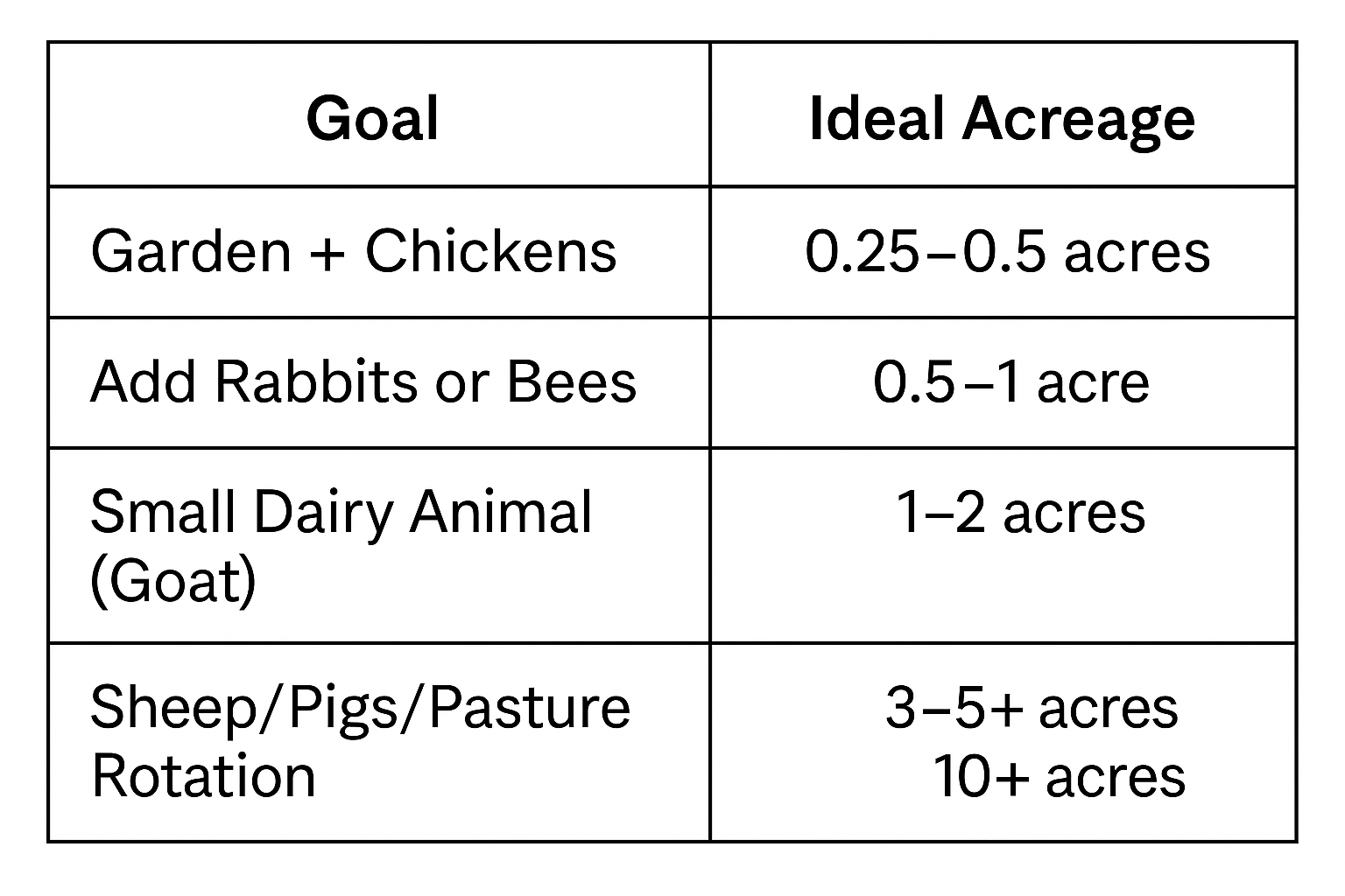 Before evaluating land or space, define your priorities. Research from ATTRA Sustainable Agriculture and University Extension Services, shows that homesteads fail or stall most often due to unclear goals—not lack of land. Write out what success looks like for you: